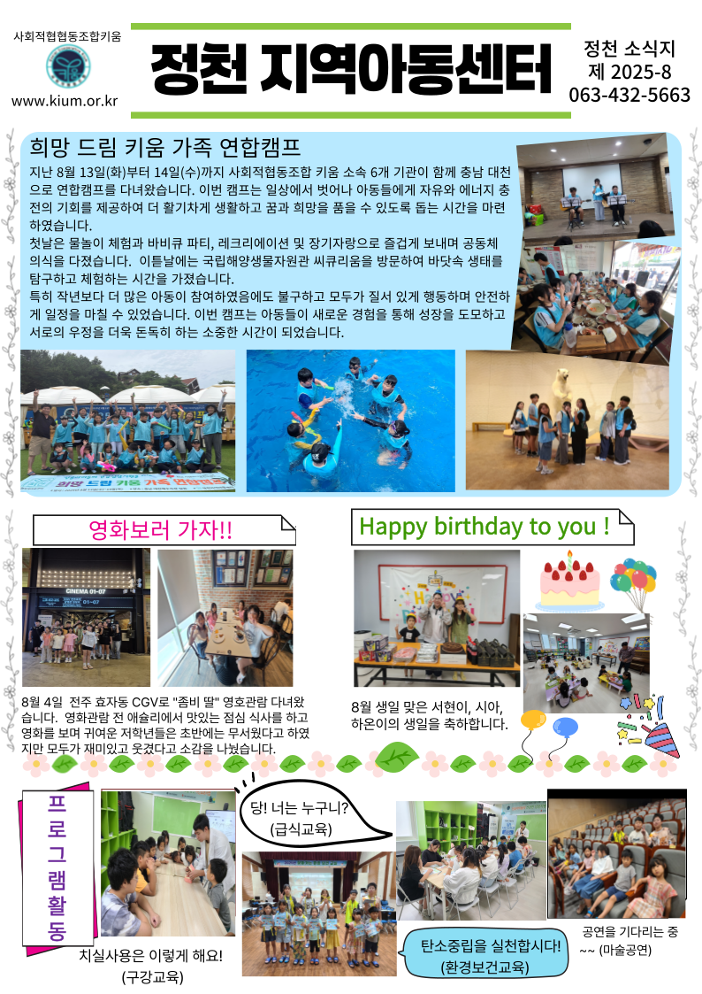 페이지 정보 목록 제목 9월 프로그램 및 8월 소식지 조회 90 작성자 키움관리자 작성일 2025-09-04 10:47 본문 첨부파일 첨부 9월 프로그램 계획안.hwp (167.0K) 이전글10월 프로그램 계획서 25.10.13 다음글8월 프로그램 계획 및 7월 소식지 25.08.05