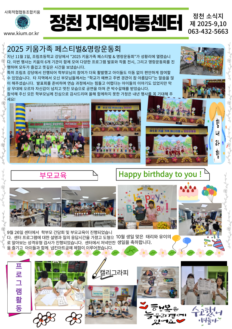 페이지 정보 목록 제목 11월 프로그램 계획 및 9,10월 소식지 조회 46 작성자 키움관리자 작성일 2025-11-04 14:56 본문 첨부파일 첨부 11월 프로그램 계획안.hwp (168.0K) 이전글12월 프로그램 계획안 및 11월 소식지 25.12.04 다음글10월 프로그램 계획서 25.10.13
